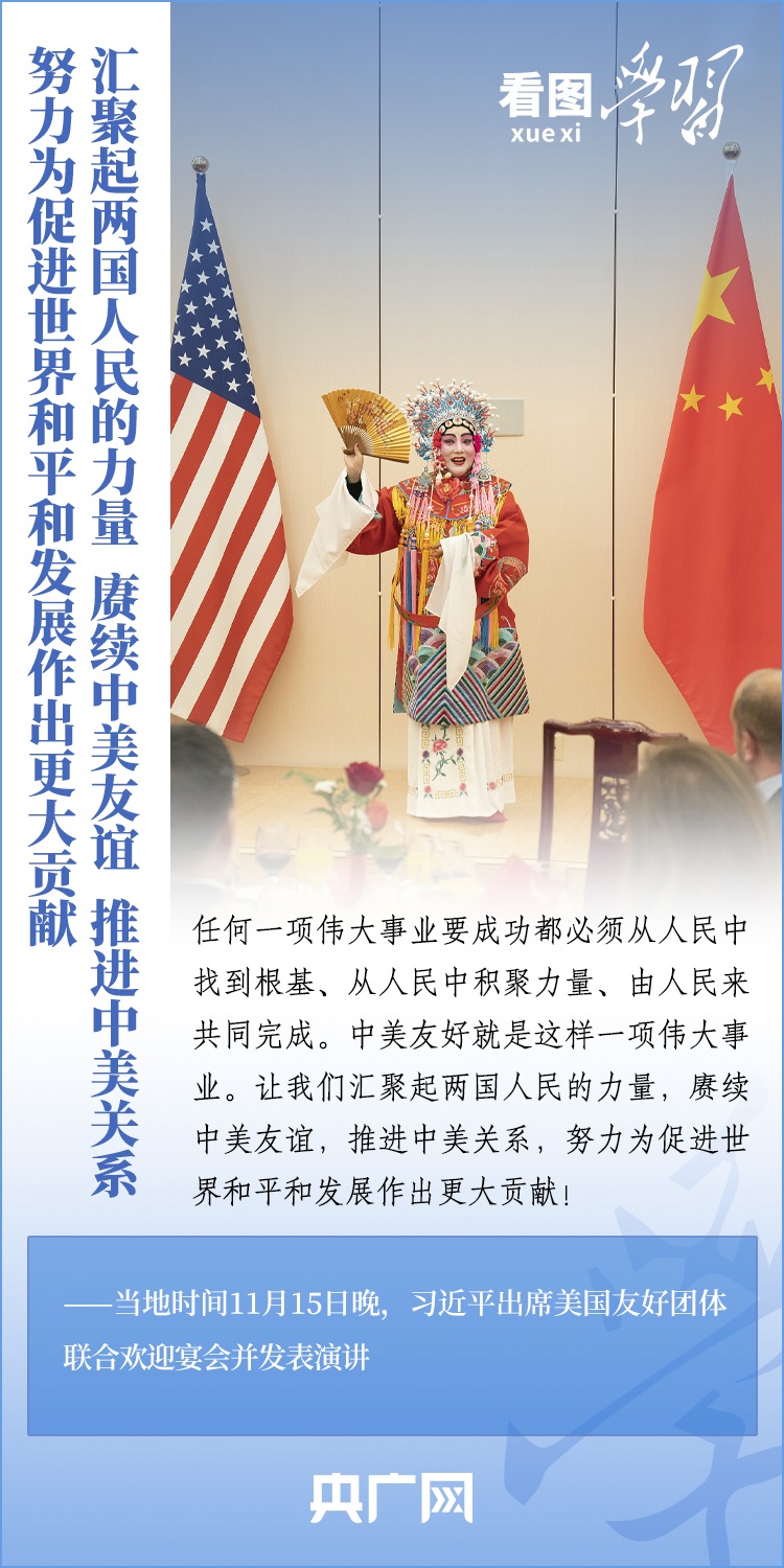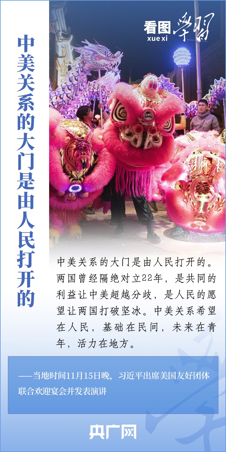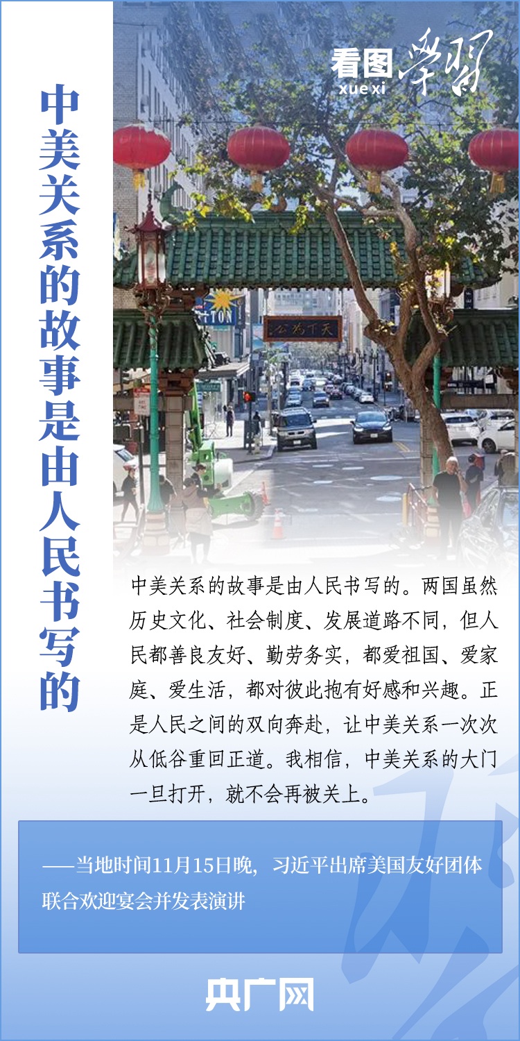 當?shù)貢r間11月15日晚,國家主席習近平在美國舊金山出席美國友好團體聯(lián)合舉行的歡迎宴會并發(fā)表重要演講。習近平主席在演講中系統(tǒng)闡述了關(guān)于中美關(guān)系的一系列觀點、立場、原則,強調(diào)“中美關(guān)系希望在人民,基礎(chǔ)在民間,未來在青年,活力在地方”,希望匯聚起兩國人民的力量,賡續(xù)中美友誼,推進中美關(guān)系,努力為促進世界和平和發(fā)展作出更大貢獻!一起來學習。