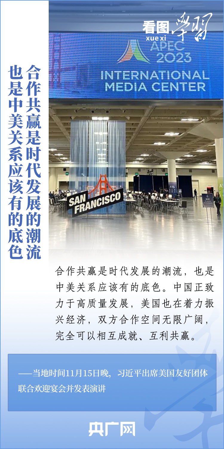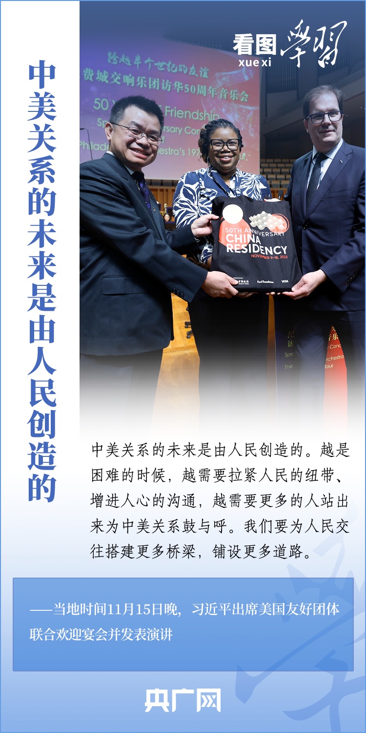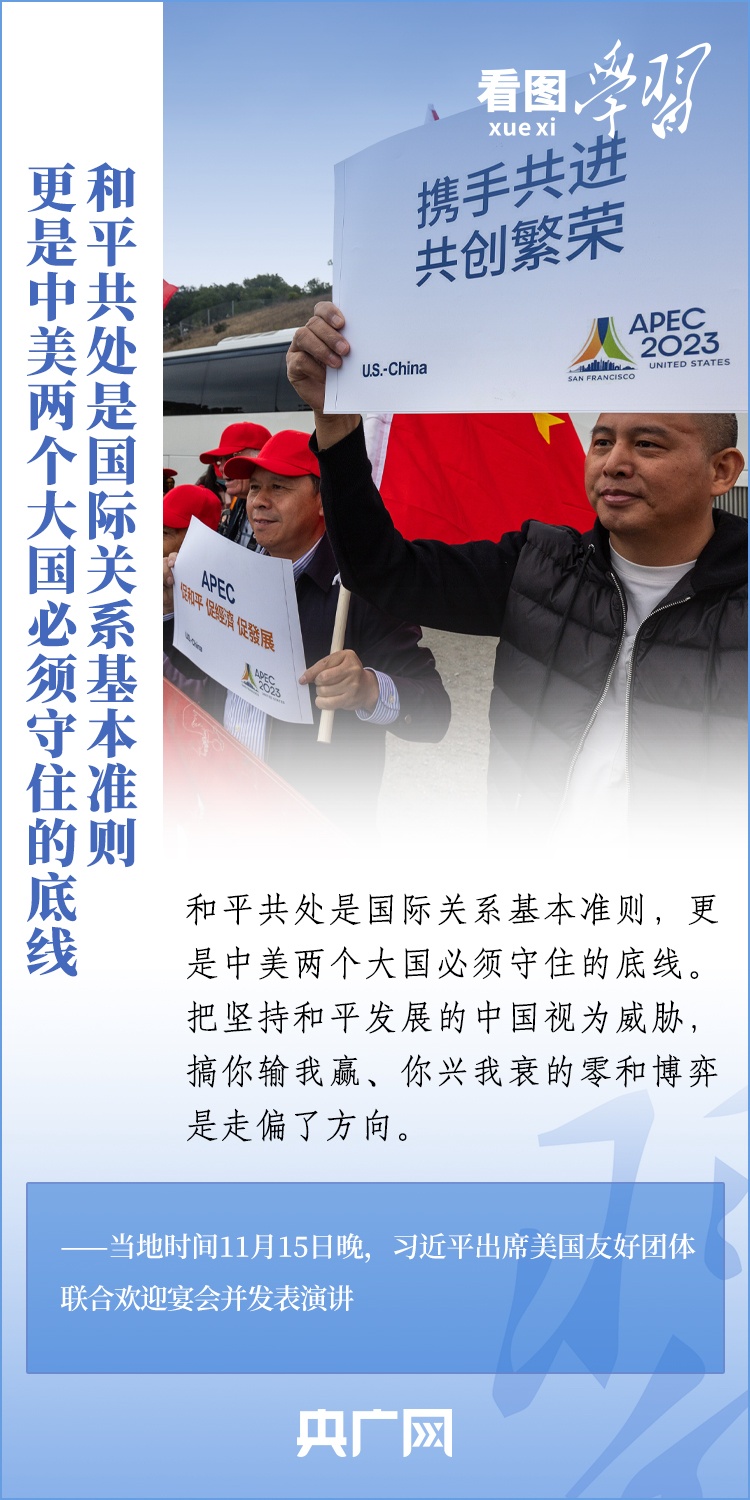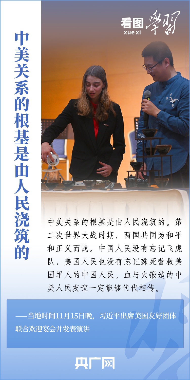 當?shù)貢r間11月15日晚,國家主席習近平在美國舊金山出席美國友好團體聯(lián)合舉行的歡迎宴會并發(fā)表重要演講。習近平主席在演講中系統(tǒng)闡述了關(guān)于中美關(guān)系的一系列觀點、立場、原則,強調(diào)“中美關(guān)系希望在人民,基礎(chǔ)在民間,未來在青年,活力在地方”,希望匯聚起兩國人民的力量,賡續(xù)中美友誼,推進中美關(guān)系,努力為促進世界和平和發(fā)展作出更大貢獻!一起來學習。